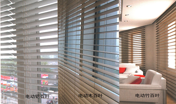 室内电动百叶帘,根据材质可分为电动铝百叶、电动木百叶、电动竹百叶,系统通过卷绳系统带动帘体的上下运行及帘片翻转,起到光线调节与导引,遮阳隔热及装饰美化的作用。电动百叶帘安装于室内或双层玻璃间,使用寿命长,易于清洁与维护(无风力影响),易于安装,造价较低(相对于室外百叶), 同时对建筑结构没有影响;配合高反射玻璃或双层呼吸式幕墙玻璃的优化组合的动态使用。